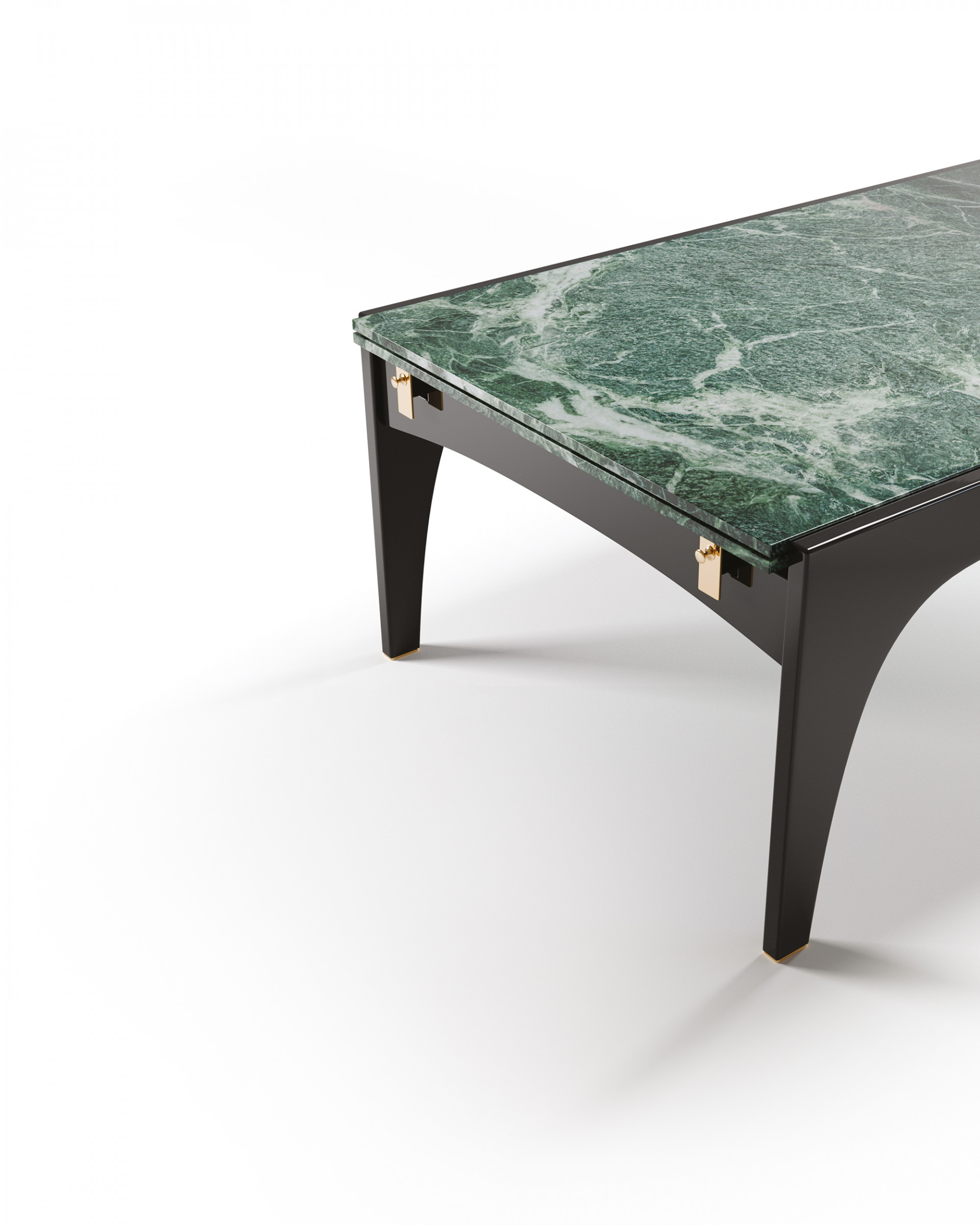 La base del tavolo, disponibile in tutte le finiture laccate lucide, è formata da multistrato rivestito in alluminio. Il top è disponibile in tutte le finiture di marmo.